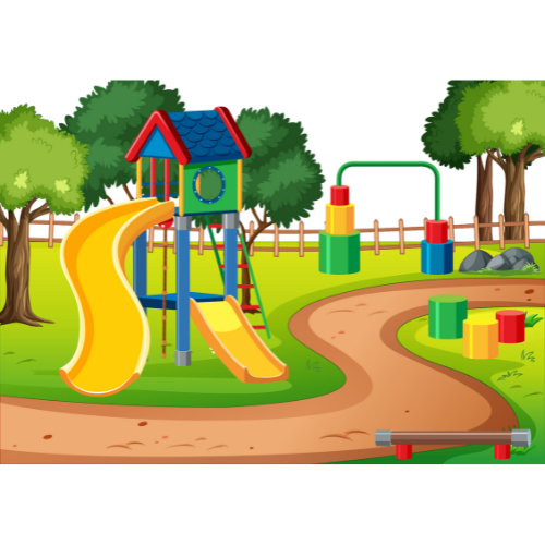 A lush green play area is equipped with swings, slides, bouncy, tunnels, trampoline.